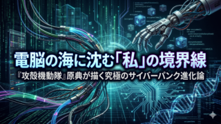 伝説のサイバーパンク『攻殻機動隊』の原典漫画をプロの視点で徹底解剖。草薙素子と人形使いの融合が意味するものとは?あらすじから主要キャラクターの深層心理、光学迷彩やフチコマの魅力まで、情報の海に沈む「私」の在り方を問う重厚なレビューをお届けします。