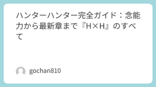 漫画 ハンターハンター完全ガイド:念能力から最新章まで『H×H』のすべて 『HUNTER×HUNTER』の魅力を徹底解説!主人公ゴンやキルア、クラピカ、レオリオといった主要キャラクターから、奥深い念能力の概念、そしてハンター試験編から暗黒大陸編までの物語のあらすじまで、H×Hのすべてを網羅。不朽の名作の魅力を深掘りしましょう。 2025.07.15 バトル漫画能力