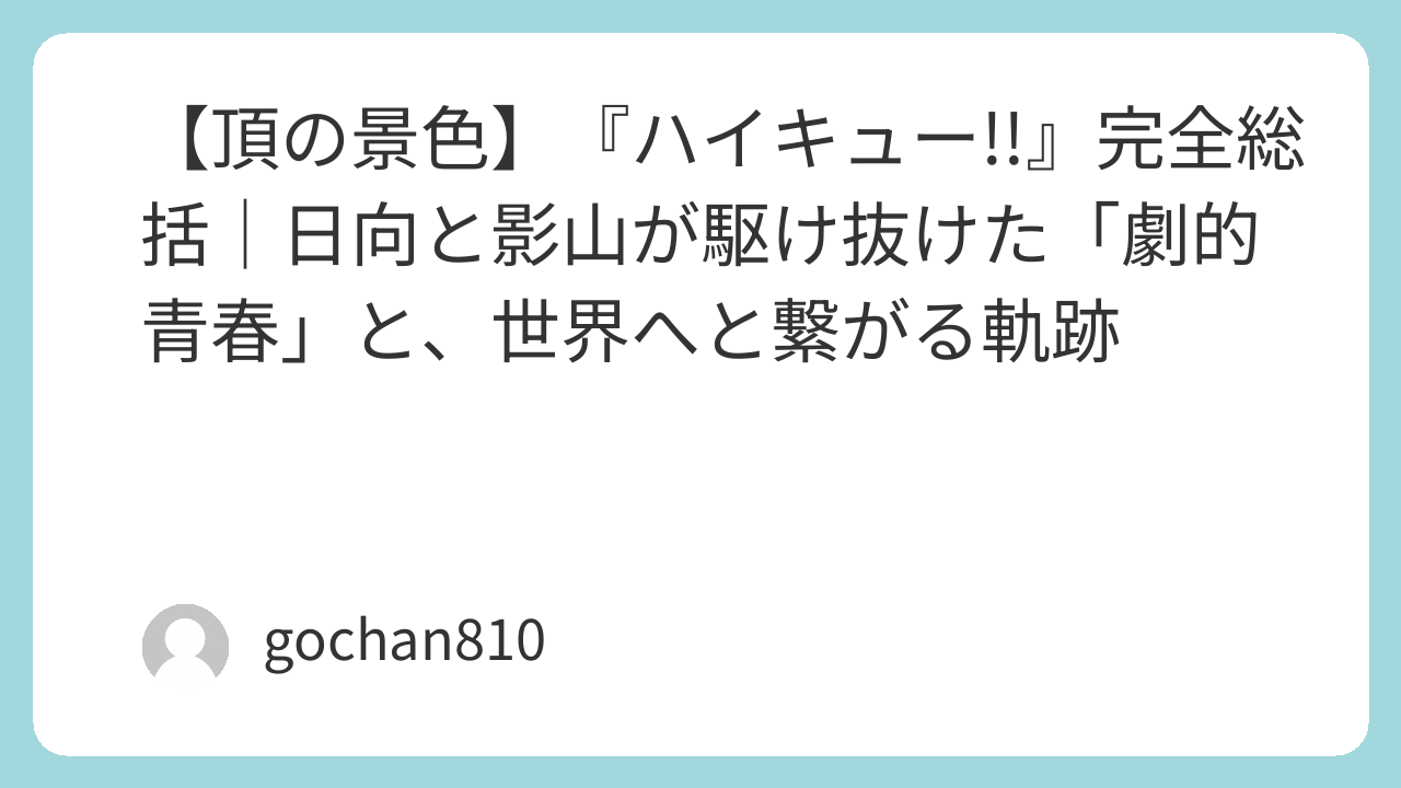 バレーボールは常に上を向くスポーツ。一度地面にボールが落ちれば、そこで終わる。だからこそ、落とさないために、繋ぐために、泥臭く足掻き続ける。その姿に、私たちは自分自身の日常や挑戦を重ね合わせ、勇気をもらうのです。物語が完結しても、日向と影山、そして彼らを取り巻くすべての人々の物語は、私たちの心の中で「現在進行形」で続いています。