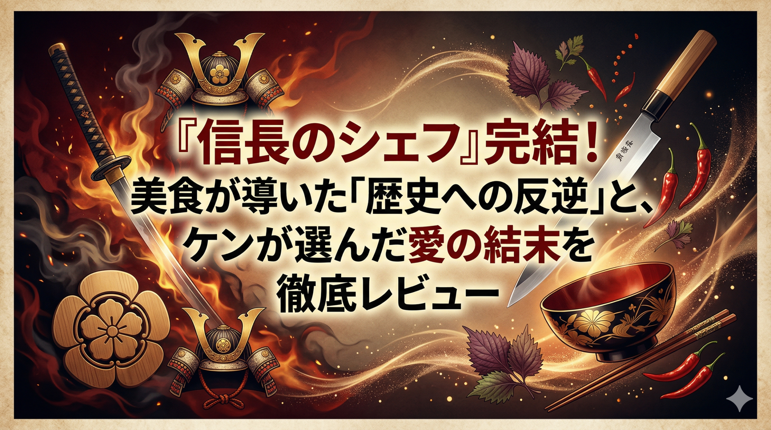 ケンの物語は、ハッピーエンドで幕を閉じます。信長が生き残り、ケンは夏と結ばれ、新しい命が誕生する。これは歴史改変かもしれませんが、物語としてはこれ以上ないほど「正しい」結末です。なぜなら、ケンはこの過酷な時代に「優しさ」と「豊かさ」を料理で植え付けたからです。